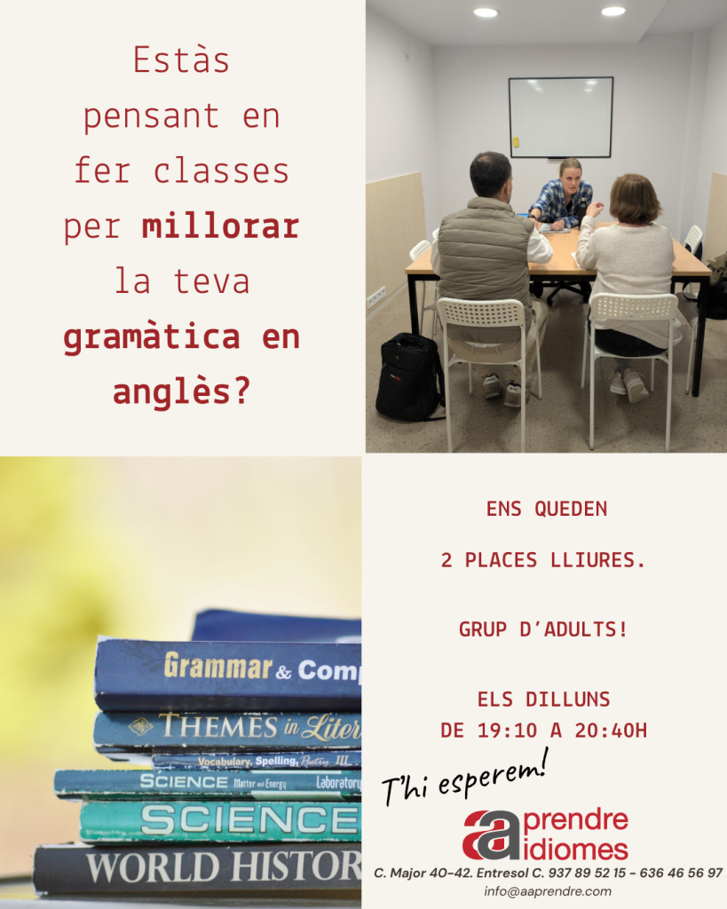 Ens queden dues places disponibles en un grup de gramàtica per a adults els dilluns de 19:10 a 20:40h.